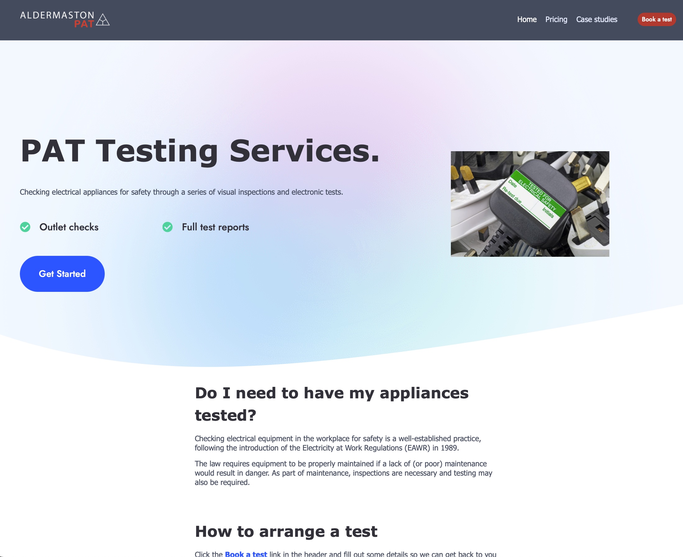 Site to advertise services for the local PAT Testing company. Includes a price calculator.