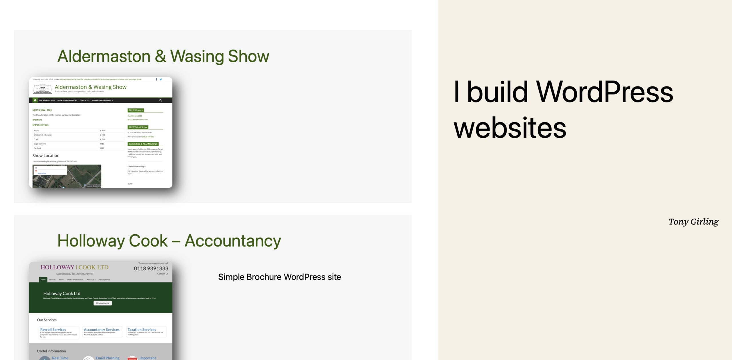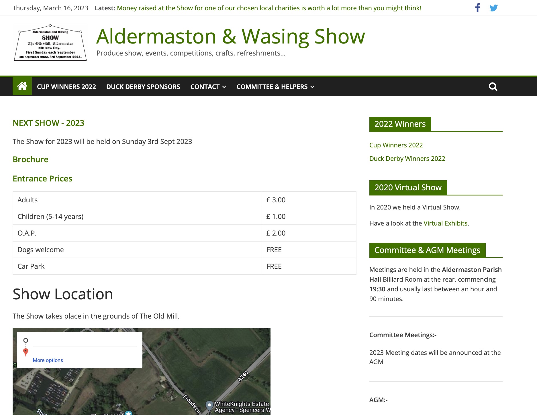 This is a website for the local community’s annual produce show. Mainly for providing information to visitors to the show it also includes a simple WooCommerce setup to take payments for local crafters to hire a table.
